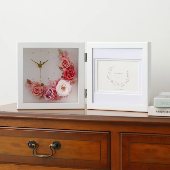 コンパクトなサイズの時計付きプリザーブドフラワーなら、いくつあっても場所を取らず迷惑になりません。