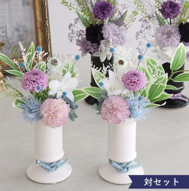 花瓶の水には雑菌やカビが繁殖しやすく、特に免疫力が低下している方や重度のアレルギーをお持ちの方には配慮が必要とされています。水を使わないプリザーブドフラワーなら、こうした衛生面の心配がなく、手入れの負担も軽減されます。 - 仏花用のデザインが豊富